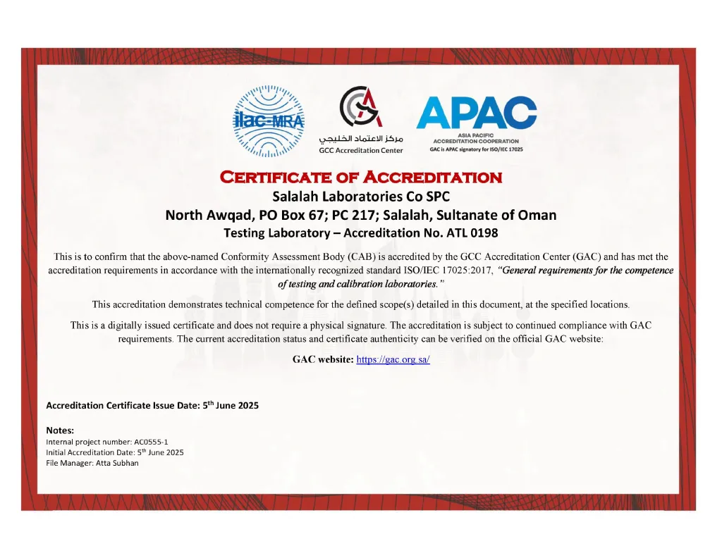 Salalah Laboratories is officially accredited under ISO/IEC 17025:2017 by the GCC Accreditation Center (GAC) — the recognized regional body for testing and calibration laboratory accreditation.